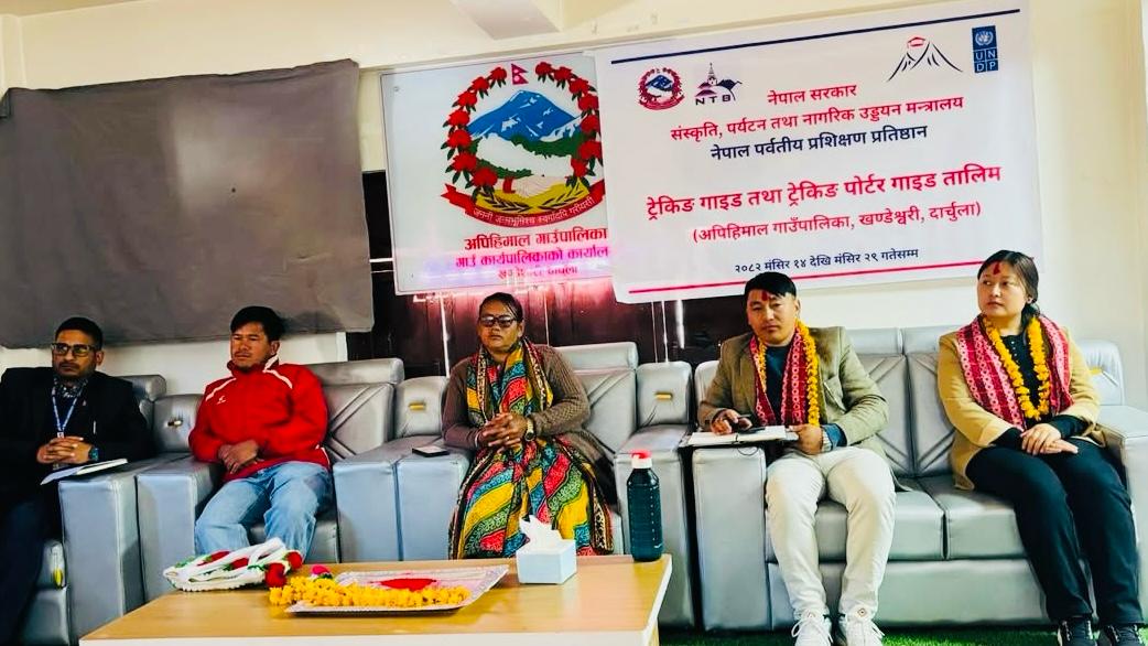 • दार्चुला । नेपाल पर्वतीय प्रशिक्षण प्रतिष्ठान (Nepal Mountain Academy) ले मङ्सिर १४ गते देखि नेपाल पर्यटन बोर्डको दिगो पर्यटन परियोजना (UNDP सँगको साझेदारी परियोजना) र अपिहिमाल गाउँपालिका, दार्चुलासँगको सहकार्यमा अपिहिमाल गाउँपालिका, दार्चुलाको खण्डेश्वरीमा ट्रेकिङ गाइड तालिम सुरु गरेको छ। साथै मङ्सिर २१ गतेदेखि खण्डेश्वरीमा नै पोर्टर गाइड तालिम सन्चालन गर्ने तयारी गरेको छ।