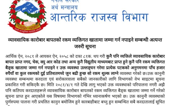 व्यावसायिक कारोबार बापतको रकम व्यक्तिगत खातामा जम्मा गर्न नपाइने सम्बन्धी अत्यन्त जरुरी सूचना