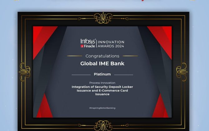 ग्लोबल आइएमई बैंक इन्फोसिस फिनाकल प्रोसेस इनोभेसन अवार्डद्वारा सम्मानित