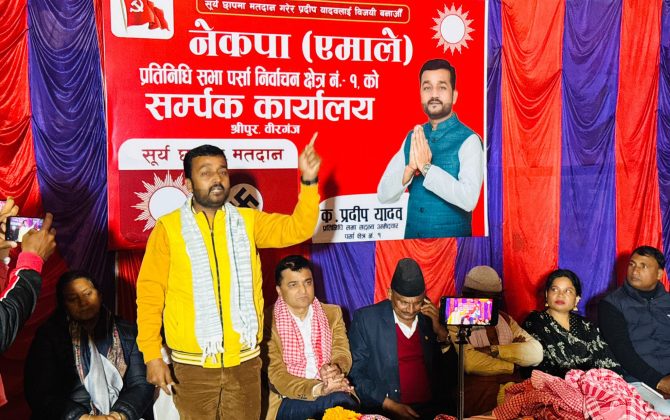 वीरगंज — पर्सा निर्वाचन क्षेत्र नम्बर–१ अन्तर्गत वीरगंज महानगरपालिका वडा नम्बर–१२ श्रीपुरमा नेकपा एमालेका प्रतिनिधिसभा उम्मेदवार प्रदीप यादवको सम्पर्क...