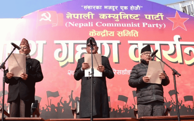 प्रचण्ड र माधव नेपालले नेकपाको शपथ लिए